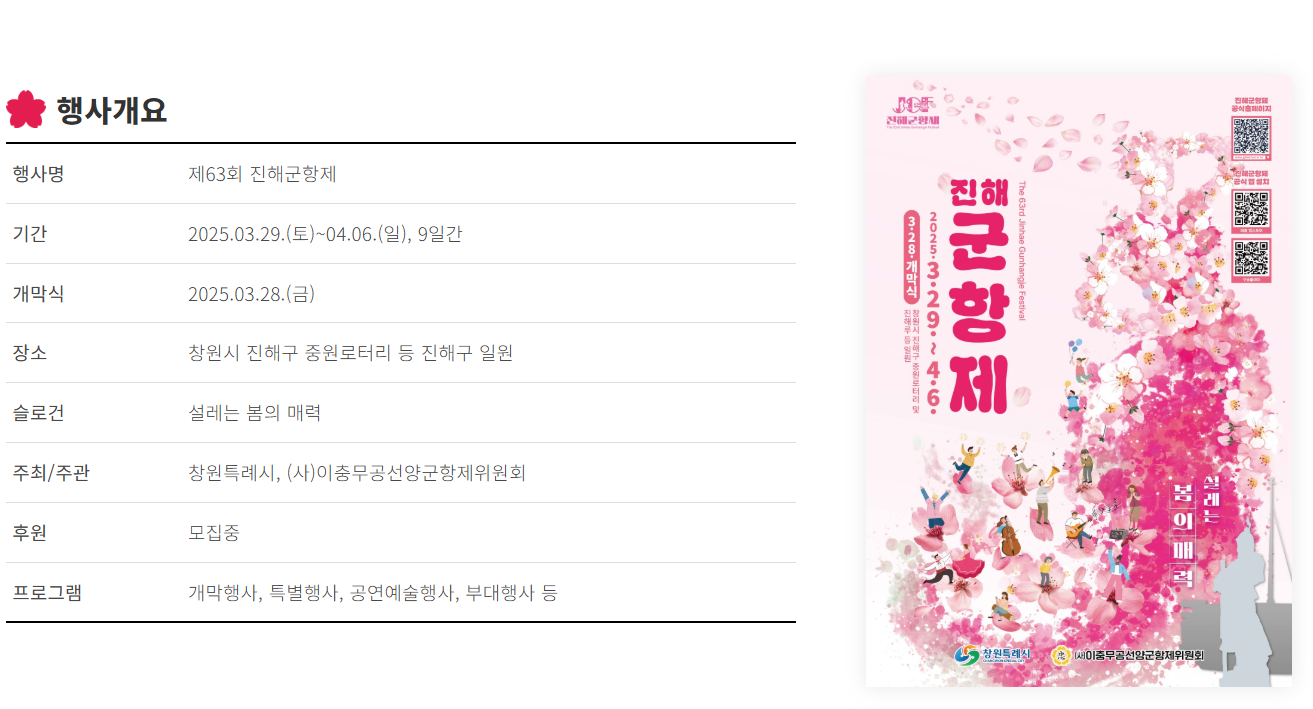 ✅ 소개 : 진해군항제는 국내 최대의 벚꽃 축제로, 약 36만 그루의 벚나무가 도시를 수놓습니다. 여좌천 로망스 다리, 경화역 등 유명한 벚꽃 명소를 따라 다양한 문화 행사와 퍼레이드가 진행됩니다.